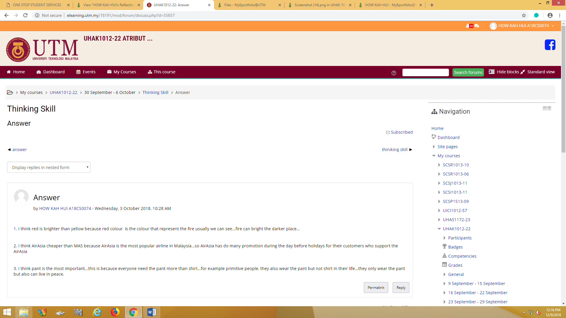 Dr Nurul Aini want to train our thinking skill, so she has ask some questions. We are required to answer the question set by her without refering any source: