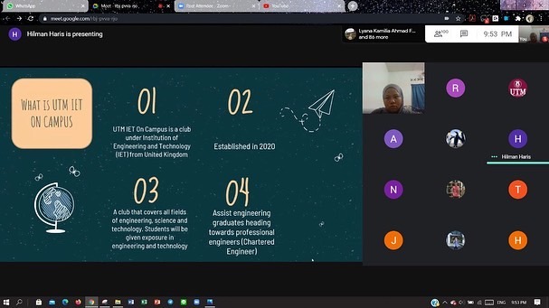 Welcome to IET talk was held on 27th of October 2020 using an online meeting platform that is Google Meet. The main objective of the talk is to expose and teach UTM students about Institution of Engineering and Technology (IET) and its club in UTM that is “UTM IET On Campus”. The talk gives insights and vision about what IET is all about and the opportunities it offers for engineering IET members for their long-term career. The talk shows new opportunity and engineering career path for me to think and resolve. The speaker give’s vision on every way to become certified professional Engineer, mainly using IET path. This correlates with the success attributes that is to be entrepreneurial while also developing thinking skills to plan through my future path to become a certified professional engineer. The talk also provides a Q&A (Questions and Answer) session where participants can ask freely to the speaker (advisor of UTM IET On Campus) that allow us to gain more information from the speaker straight away that helps me on all of my confusions. After the talk, I successfully registered as an UTM IET On Campus member that updates me on any IET campaign, opportunities and activities directly.