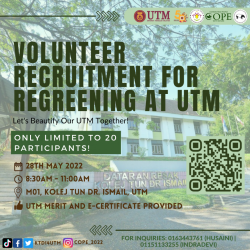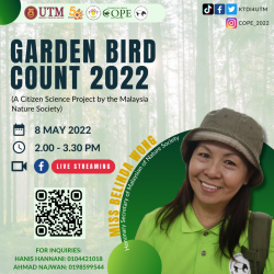 This program was held for a certain period. A total of 3 online talks were held, where 2 talks were from MNS and one from WWF. Meanwhile, the competitions held were the Bird Race competition and the UTM City Nature competition. Alongside that 2 physical activities were held. The first is the Regreening at UTM and the next is the Regreening at Tanjung Piai.