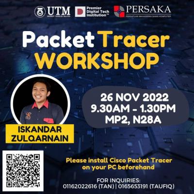 As a crew member of the Packet Tracer Workshop 2022, I had the privilege of being part of an event that aimed to enhance students' understanding of networking concepts. The workshop, organized by Persatuan Mahasiswa Sains Komputer Universiti Teknologi Malaysia (PERSAKA UTM), provided an overview of the Packet Tracer application and offered participants the opportunity to gain hands-on experience with the guidance of an expert.