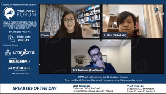 Pada 21 dan 23 Jun 2020, AIESEC Johor Bahru dengan kerjasama UTM Center for Student Innovation and Technology Entrepreneurship (UTM XCITE), telah mengadakan Virtual Youth Speak Forum 2.0. Program ini diadakan selama 3 minggu bermula pada 6 Jun sehingga 23 Jun 2020 dan disiarkan di Facebook UTMXCITE. Bertemakan “Connecting YOUth to COVID-19”, program ini bertujuan untuk mengurangkan beban orang muda apabila berhadapan dengan pandemik ini. Topik yang diketengahkan termasuklah berkaitan kesihatan mental hingga kualiti Pendidikan.