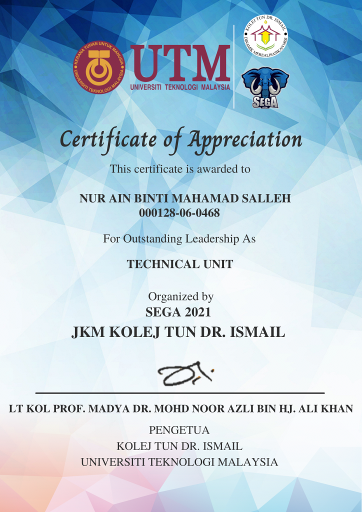 Jawatankuasa Kolej Mahasiswa Kolej Tun Dr Ismail (JKM KTDI) had organized an event named “SEGA’21” as an annual event for the college. This program was been directed by Muhammad Daniel Hamdan, JKM KTDI and has been held from 21/3/2021 until 3/4/2021. The objectives and goals of this program are to expose students who are staying in KTDI with e-sports such as PUBG Mobile, Mobile Legends and DOTA 2. Apart from these, some of the activities which was been conducted online are virtual run and virtual sit-up. I have joined this event as a crew in technical unit. The main reason for joining this event was because I wanted to develop and improved the soft skills inside me especially during the pandemic. This event was conducted very smooth since the organizer itself has a very good planning upon this event. Not only that, this event allows the student to take a break from their academic that surely is overloaded especially during this online class. It helps student to release their stress as well as improving their skills in some affordable sports. By joining as a crew, in which working as technical unit, I have to learn to use the OBS Studio for the live stream since this event is conducted online. However, OBS Studio is a free software and the organizer itself has already mastered to use the software. Thus, he taught