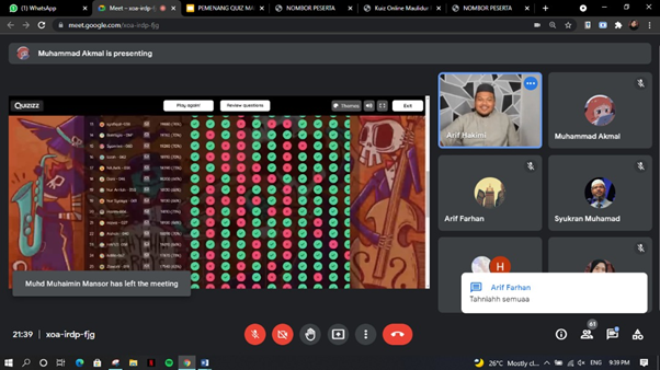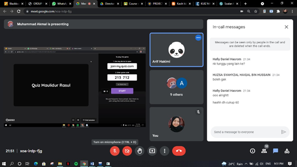 Kuiz Maulidur Rasul was held virtually via Google Meet and Facebook Live in conjunction of celebration Prophet's birthday which is also known as Maulidur Rasul. This program was opened for UTM students either Muslim or non-Muslim. The objectives of this progam were, commemorate the history of the Prophet Muhammad and take lessons from the sacrifice of the Prophet to his people for Muslims along with developing the knowledge and history of Maulidur Rasul. Apart from that, non-Muslims can take the opportunity to find out about the way Muslims provide treatment regardless of religion.
