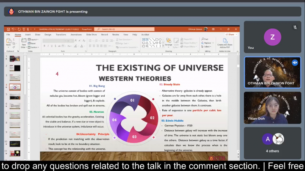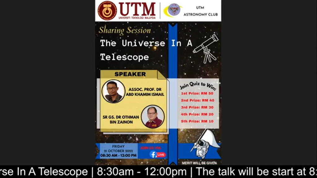 In 21 October 2022, I have join a program that been organized by UTM Astronomy Club (UTMAC) that was conducted online via Facebook Live. In the program, UTMAC has created an opportunity for us to learn or explore more about the outer space which we can see using our telescope. It is 2 hours long of informative session by our two speakers which are Assoc. Prof. Dr Abd Khamim Ismail and Sr Gs. Dr Othman Bin Zainon. Not to forget our Emcee (Goh Yitian) which help the program to went smoothly. In the sharing session also shows us about different types of telescopes and we can also make Do It Yourself (DIY) telescope. Another part of sharing session also explain how our universe comes to be by looking different types of theories such as Big Bang, Steady State, Edwin Hubble, Uncertainty Principle, and Newton. Not only that, they also share the information about the history of how telescope are created such as from the golden age of looking stars for navigation until how they created the telescope. Lastly, UTMAC also created a quiz section using Quizizz which you can get prizes (money) based on what you have learned from the sharing session.